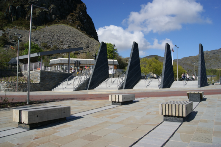 The pillars that form the centrepiece of the Blaenau Ffestiniog regeneration scheme are inspired by the distinctive triangular shape of the slate splitter’s chisel. Each pillar is over 7.5 metres high and each is built with approximately 15,000 slates from Llechwedd slate quarry. The slates are laid at 30 degrees, the angle of the slate beds in the quarry. This geological reference is complemented by a cultural one: like veins in the slate beds, bands of polished slate run through the pillars, engraved with poetry and quarry sayings.
